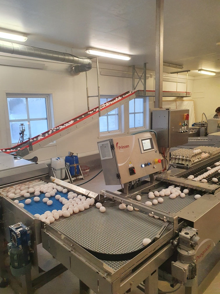 Eggene vaskes, lyses og pakkes i kartong i eggpakkeriet på gården, og distribueres direkte til butikkerkantiner og hoteller i Vesterålen og Lofoten under varemerket Vesteråslegg.